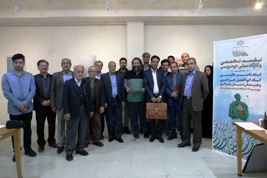 همزمان با فرارسیدن سالروز شهادت سید شهیدان اهل قلم شهید سیدمرتضی آوینی و گرامیداشت هفته هنر انقلاب اسلامی، به همت واحد هنرهای تجسمی حوزه هنری استان مرکزی نشست تخصصی و کارگاه عملی خوشنویسی با حضور استاد ناصر طاووسی و استاد ابوالفضل خزاعی از اساتید مطرح خوشنویسی کشور در اراک برگزار شد.