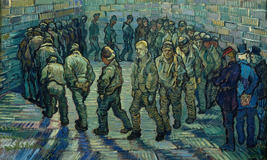 حلقهای از زندانیان که در حیاط زندان آهسته قدم برمیدارند در حالی که چندین نفر اعمال آنها را نظارت میکند به بهترین نحو ممکن طرز فکر هنرمند را که درگیر روزمرگی شده را به خوبی به بیننده القا میکند. تصویر به حدی گویاست که حتی میتوان صدای کشیده شدن پوتینهای روی زمین را شنید.