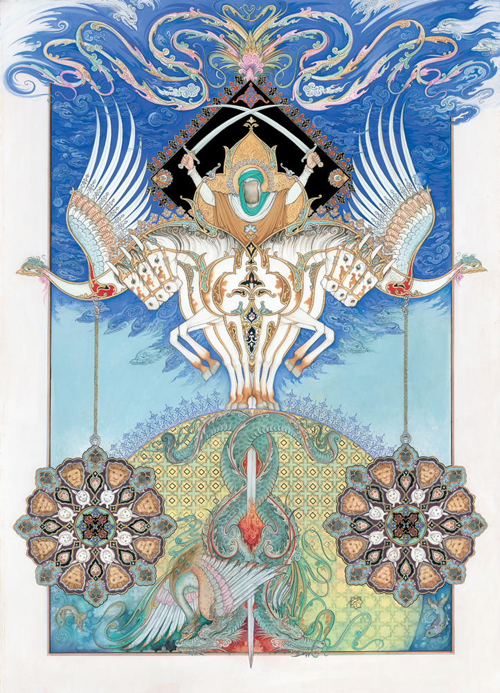 من در قسمت پایین کار اژدها را کشیدهام که از وحدت خارج شده و به گوشه چپ تابلو رفته و سیمرغ که نماد حق است بر آن غلبه کرده و در حال از بین بردن اژدهاست. دقیقا در مرکز ثقل ترازوی عدالت و پایه ترازو یک شمشیر کشیدهام که درون شکم این اژدها فرورفته است.