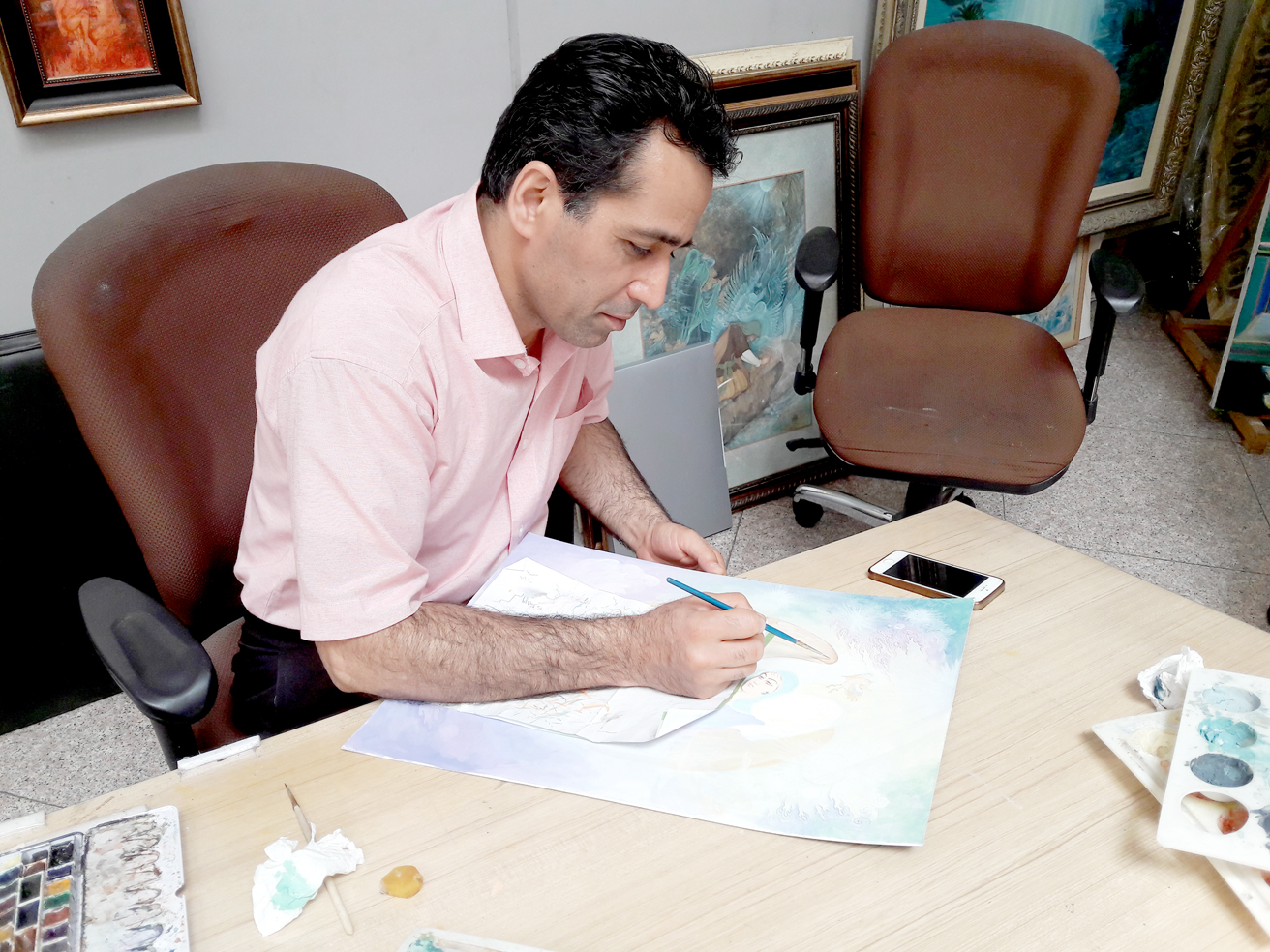 در تابلوی شعبان من یک ترازویی کشیدم و امام زمان(عج) را در مرکز ثقل ترازوی عدالت قرار داردم. ایشان در میان دو کفه ترازو و در وسط قرار گرفته بخاطر اینکه با ظهورشان میانه روی و عدالتگستری میکنند. دوکفه ترازو در دو طرف کار کشیدم، شیر و خرگوش را کشیدم چرا که با ظهورشان به کسی ظلم نمیشود و قدرتمند و ضعیف در کنار هم قرار میگیرند، سیاه و سفید پوست درکنار هم قرار میگیرند و به همین دلیل یک چهره سیاه پوست و یک چهره سفید پوست کشیدهام . این حکایت از میانه روی و عدالت گستری امام زمان(عج) دارد. دو طرف بازوهای ترازو را با سیمرغ نشان دادم چرا که سیمرغ نماد حق است. بالهای سیمرغ را با قبضههای شمشیر کشیدهام که یاران امام زمان هستند که به کمک ایشان میآیند. در پس زمینه ظهور امام زمان(عج) یک مربع کشیدهام که مشکی رنگ است که همان مربع کعبه است که در واقع نشان دهنده این است که از حرم امن ظهورشان شروع میشود و در نهایت عالم به حرم امن تبدیل میشود وقتی ظهور میکنند. در قسمت پایین تابلو کره زمین قراردارد که زیر پای اسبهاست و به صورت مربع های مشکی کشیدهام که شروع نمایشگاه با این اثر بود و این بخاطر این بود که در ماه شعبان برگزار شد و من خواستم که این اثر ارائه بشود و خیلی از مخاطبین به مفهوم شعبان پی ببرند.