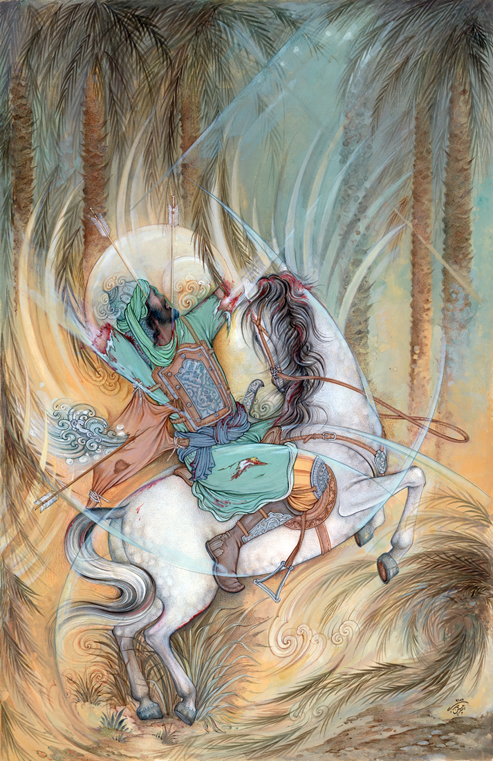 یا در تابلوی دیگری که دستهای قطع شده حضرت ابوالفضل(ع) را در نخلستان به نمایش گذاشتهام با اینکه دستهای حضرت را قطع شده کشیدهام ولی اقتدار حضرت را در اثر تصویر کردهام و دستها را رو به بالا و آسمان کشیدهام و نورهای آسمان را با نور جای خالی دستها یکی کردهام و حرکت شمشیرهایی که مخفیانه در نخلستان بر حضرت وارد میآمده است را نشان دادهام.