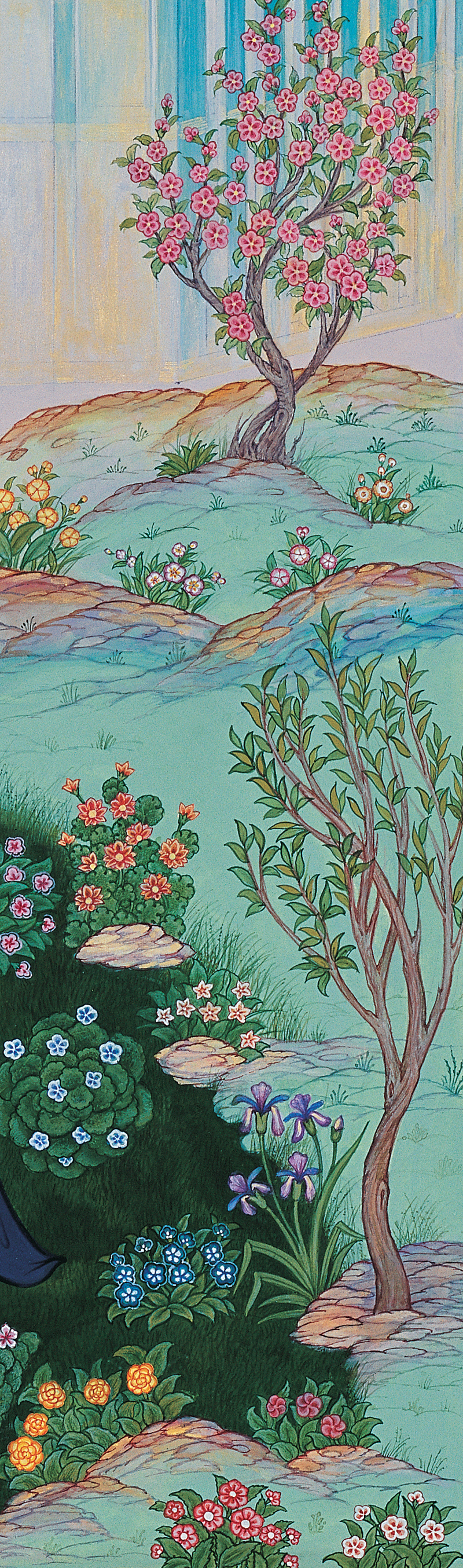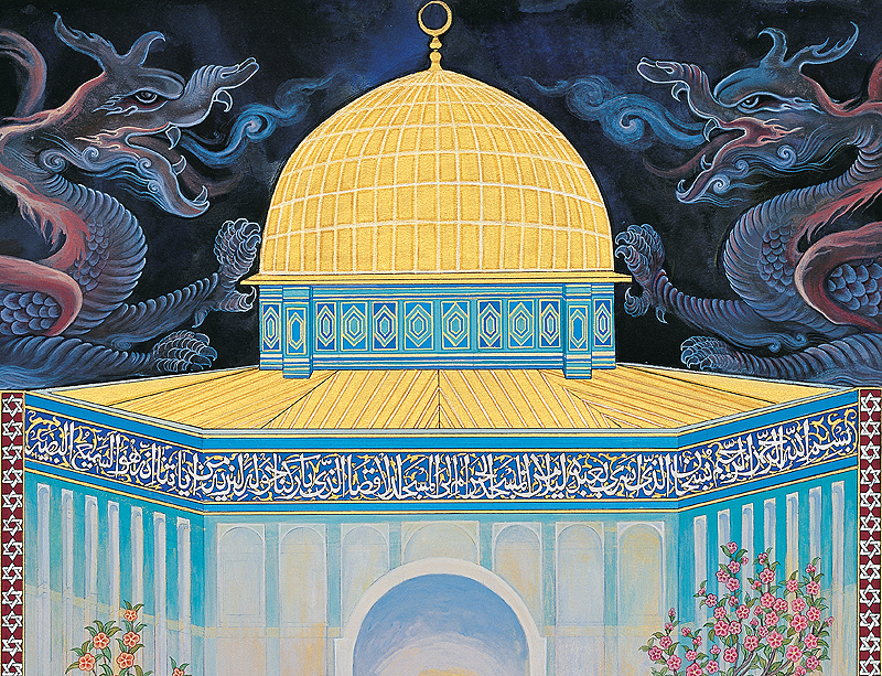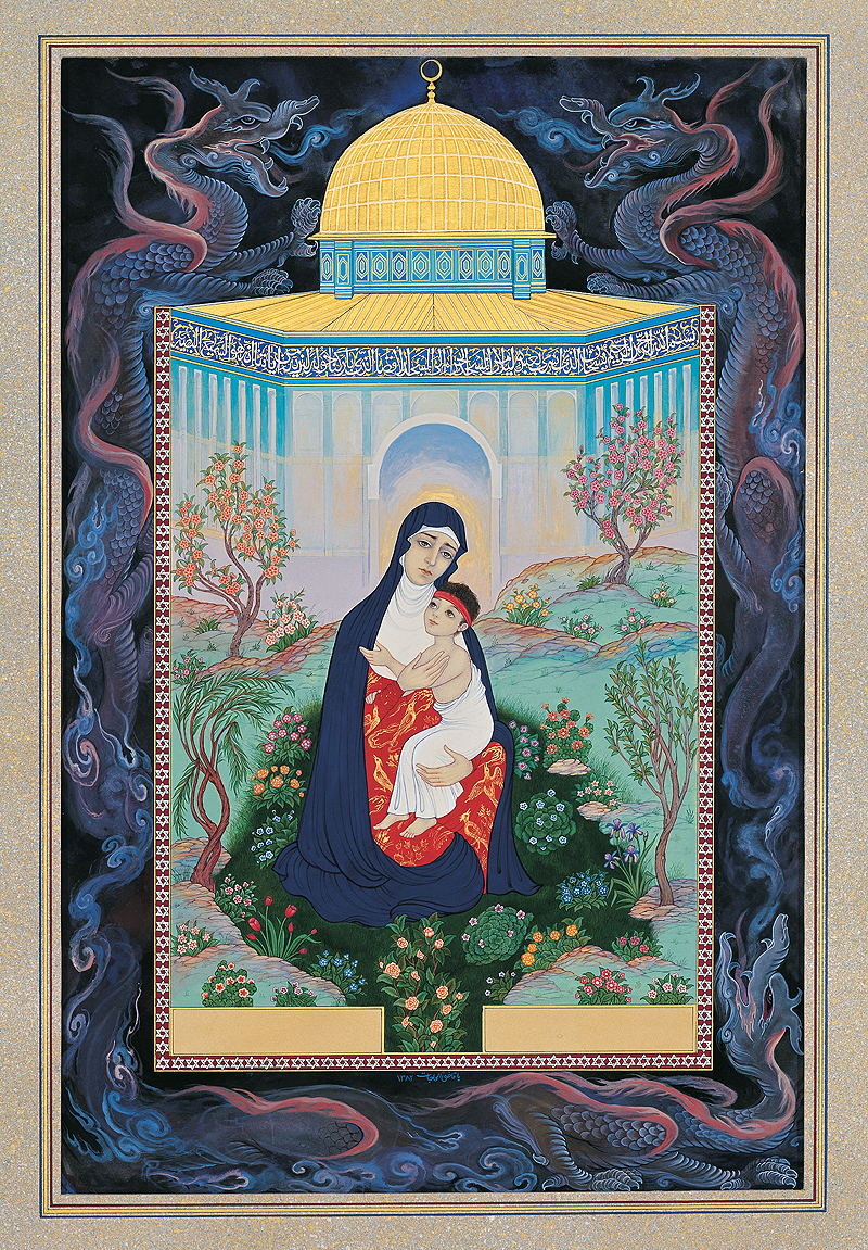 از توصیفات شاعرانه تابلو که بگذریم، قاضیزاده تابلو را به سه بخش اصلی تقسیم میکند، بخش اصلی به مادر و کودک و روایت تاریخی تابلو میپردازد. در بخش دوم ما با بنای قدس شریف روبرو هستیم که به گونه ای بی نظیر فضای دو بعدیِ نگارگری را با پرسپکتیو خود بنا درهم آمیخته است . نکته های جالب در این بخش، به کارگیری نوارِ حاشیه ای بین بخش سوم تابلو است که نشانه های از ستاره داود به رنک قرمز و سیاه است که حس اسارت را در ما بیشتر میکند. قاضی زاده با بهره گیری مناسب از خوشنویسی حس بی نظیری به ساختمان بنای قدس داده است .