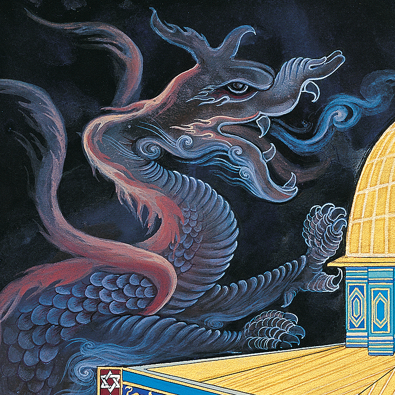 اما در بخش سوم تابلو ما شاهد چند اژدها هستیم که تمام تابلو را در برگرفته اند که در تضاد کامل با نورِ میان اثر است . تمامی این کنتراست ها توانسته بیانی دلنشین، از موضوعی بسازد که در حال نشان دادن رنج های ملتی است . عناصر در هم آمیخته، و زندگی در مرگ سکنا گزیده.