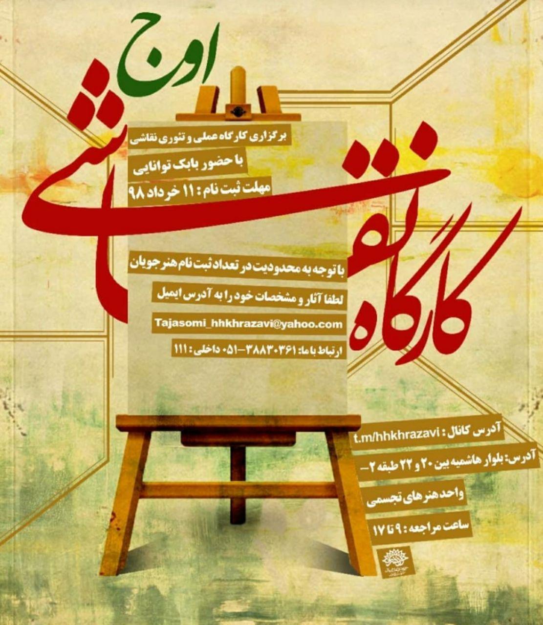به گزارش واحد خبر روابط عمومی حوزه هنری خراسان رضوی، کارگاه عملی و تئوری نقاشی «اوج» با حضور بابک توانایی و در 15 جلسه با هدف شناسایی و حمایت از هنرمندان نخبه استانی، معرفی و نمایش آثار هنرمندان و رویکردی معاصر به خلق آثار هنری با محوریت دفاع مقدس، در مشهد برگزار میشود.
