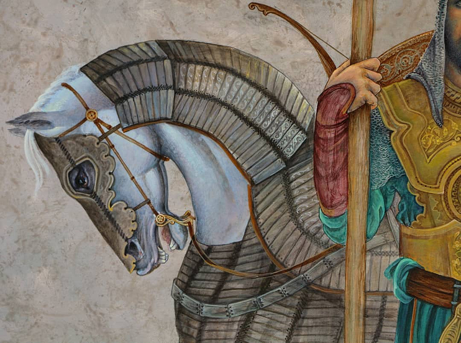 آخرین کاری که انجام دادم عنوانش «چو ایران نباشد تن مباد» هست که میتوان گفت مدافع ایران است. تصویر یک رزمنده ایران است که با عناصر مختلفی از آثار قبل از اسلام و آثار دوران اسلامی در پوشش، خنجرها و شمشیرها دیده میشود که هرکدام از اینها نمادی است از دورههای تمدن ایرانی. البته این اثر به همان شیوه، ترکیبی از کارهای قهوهخانهای ، نگارگری و نقاشی است. دلیل اینکه سعی کردم از نمادهای دورههای مختلف تمدن ایرانی استفاده بکنم این است که متاسفانه در زمانه ما سوالها و مسائل انحرافی شکل میگیرد که ذهن جوانها را گمراه میکند. مثلا ما دوران اسلامی را نادیده بگیریم و برگردیم به دوران قبل از اسلام، بعضیها هم برعکس عمل میکنند و میخواهند تمدن پیش از اسلام را نادیده بگیرند. در صورتی که هر دو اینها جزو تاریخ ایران است. تمام این ادوار، دوران تمدنی ایران است چه قبل از اسلام و چه دوران اسلامی همهاش متعلق به ماست و همهاش باعث افتخار برای ماست. مواریث این دو دوره هم وجود دارد و انسان از دیدنش لذت میبرد. بخاطر همین در آخرین نقاشی که کار کردم سعی کردم از نمادها و عناصر تصویری این دوران استفاده کنم و در واقع ادعای خودم را گفته باشم که تمام این دورهها مال ماست. هم هخامنشیان هم ساسانیان و هم قبل از اینها مال ما هستند و دوره اسلامی هم مال ماست. ما باید تمام اینها را جمع کنیم و استفاده کنیم برای تمدنسازی. رزمندهای که تمام این امکانات را از قبیل اسب و انواع و اقسام جنگ افزارها در اختیار دارد از نظر من آمادگی ما با تمام امکانات است در مقابل کسانی که میخواهند به تمدن ایران صدمه بزنند.