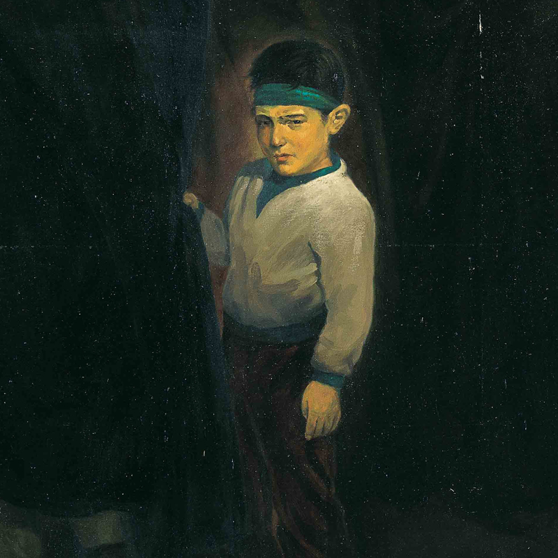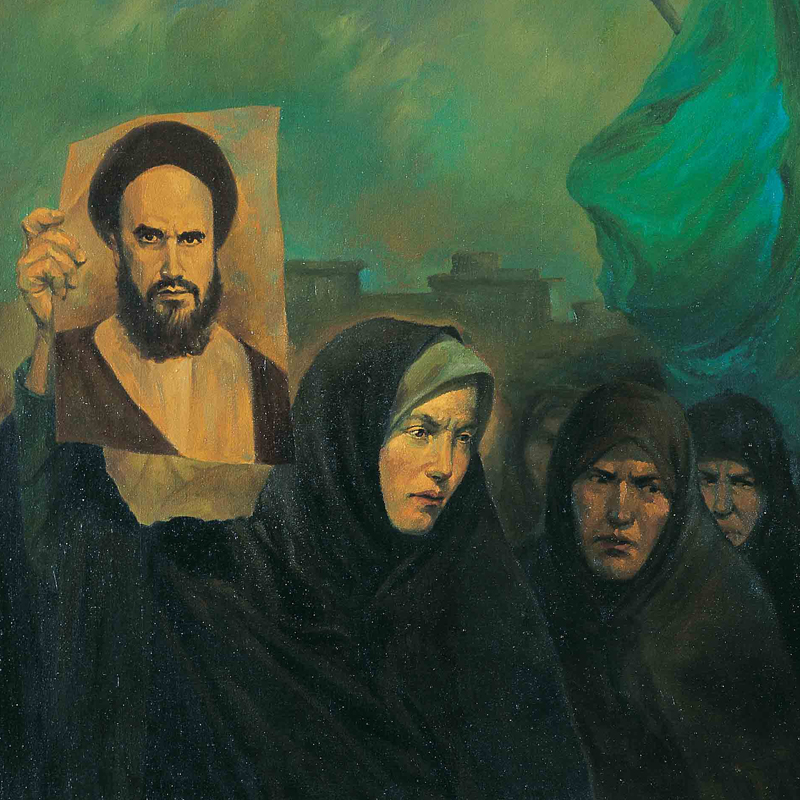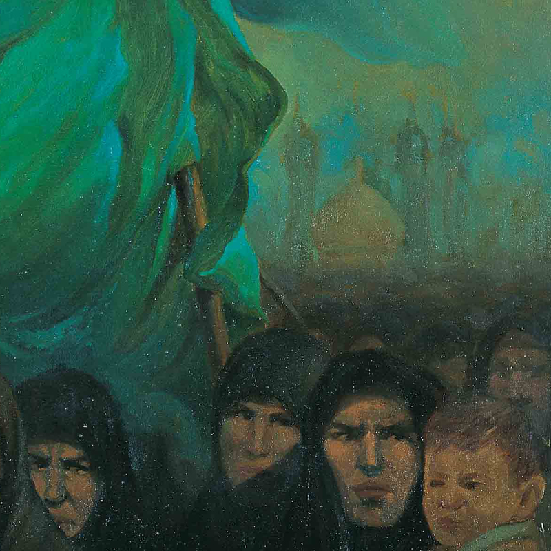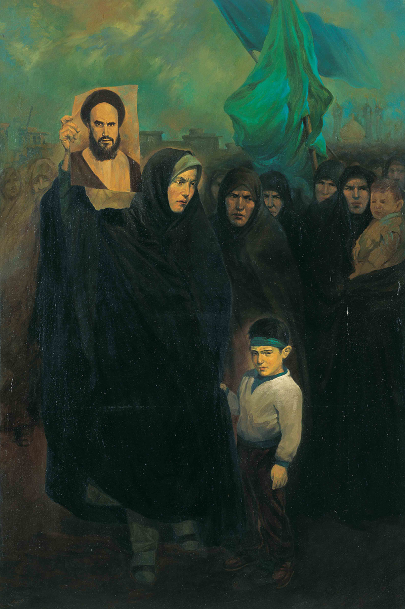 در این تابلو زنی دیده می شود که تصویری از یک روحانی جوان را در دست دارد و با چشمانی که نگاه نیرومندی دارد به کودکی که دست او را گرفته، چشم دوخته است. موجی از نور امید در تصویر روحانی، مادر و کودکی دیده می شود. هنرمند در دور دست تصویری از حرم نقاشی کرده است که با پرچم هایی برافراشته در باد می تواند فضای آن روز جامعه ایران را بیان کند. جامعه ای متلاطم که آبستن اتفاقهای بزرگ است .