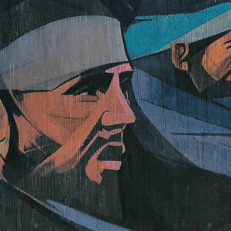 قابی بسیار کشیده که باید حتما برای دیدنش سرتان را بچرخانید. فیگوری با دست بسیار قوی پرچم یک انقلاب را در دست دارد و در سوی دیگر تابلو، فرشته ای با ظاهری انقلابی، دارد با بالهایی بزرگ پرچمی الهی را با خود حمل می کند. در مرکز تابلو پرنده ای که همان نماد استکبار است، به پرندگان منادی صلح حمله کرده است و نماد صلحی (شاخه زیتون) که از زمان حضرت نوح حامل آن است را بر دهان دارد، گویی اکنون زمان انقلاب است. نقاشی هنریست که همواره از گونه های خود تاثیر می پذیرد و نقاشی ایران در سالهای انقلاب اسلامی نیز از قاعده مستثنا نیست.