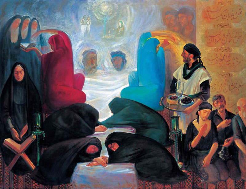 زنها مشغول سوگواری بر پیکرهایی هستند. در گوشه دیگر از تابلو مردها بر سینه خود می زنند و فردی ایستاده با گلاب و خرما و اسفند در دست به درون تابلو می نگرد. این مرد کلید ورود بیینده به بخش دوم نقاشی است بخشی که گویی در زمین نقاشی نشده است . سر دو شهید در میانه تابلو قرار دارد که باکمی توجه متوجه می شویم که همان دو فیگوری هستند که در بالای تابلو میهمان بزرگی هستند که ساحت آسمانی دارد.