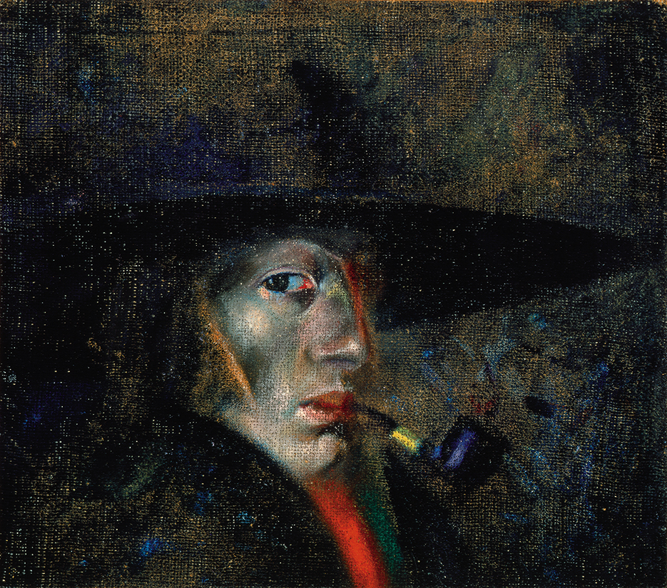 صورت با استفاده از رنگ‌های سبز زیتونی و قهوه‌ای طراحی شده است و نیم رخ یک کلاه لبه پهن را از ابتدا تا انتها به صورت یک طرح تاریک و شبح مانند نشان می‌دهد. ما متوجه می‌شویم که خط شانه‌ها یک سایه قرمز رنگ را نشان می‌دهد و او یک پیپ را نزدیک لب‌های قرمز چاقش با جزئیات لیمویی رنگ در روی پیپ به تصویر کشیده است. شخصیت تصویر شده به طرف بیننده نمی‌چرخد، به نظر می‌رسد که به ما نگاه می‌کند، جلوتر می‌رویم. این را می‌توان در جهت نگاه او فهمید که در تمام مسیر به عقب نگاه می‌کند. او می‌خواهد سرش را بچرخاند، اما انگار هر اتفاقی که می‌خواهد پشت سرش بیافتد برایش درخور توجه نیست. او مسلما آرام خواهد ماند، ارزیابی‌ای خودخواهانه و دیگر هیچ. البته این جسارت را می‌توان در سبک طراحی سلف پرتره نیز مشاهده کرد.