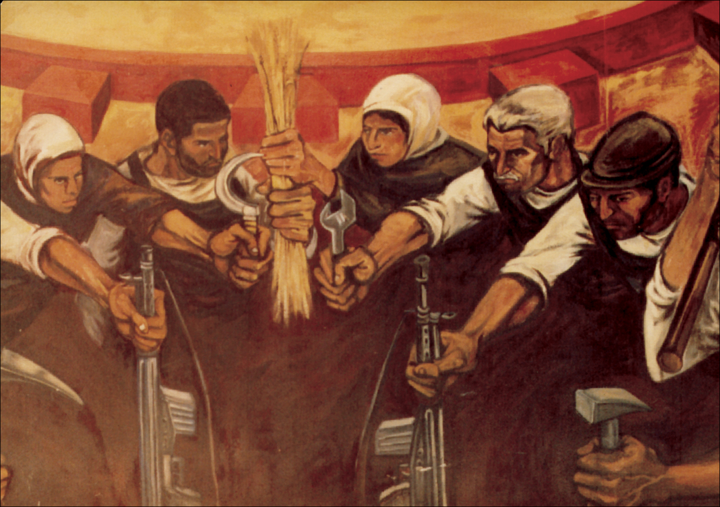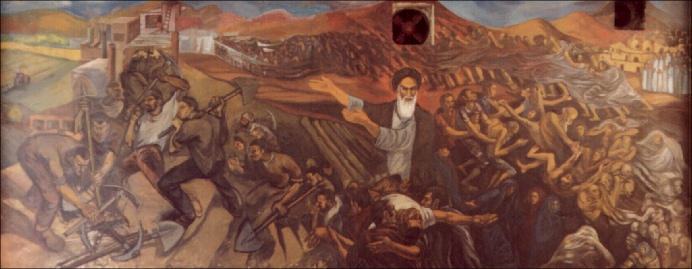 انقلاب، نیلوفر قادری نژاد با همکاری مسعود سعدالدین و هانیبال الخاص، رنگ و روغن روی دیوار دانشکده هنری زیبای دانشگاه تهران، 700×300 سانتیمتر، 1358