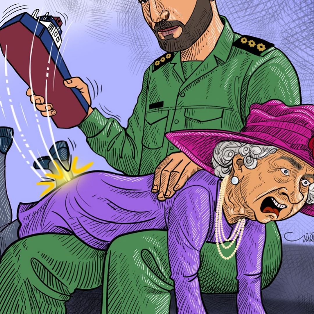 به گزارش روابط عمومی مرکز تجسمی حوزه هنری به نقل از تسنیم، عباس گودرزی کاریکاتوریست جوان کشور که با 3 اثر در نمایشگاه «ملکه کشتی ربا» حضور دارد، درباره آثار خود به خبرنگار تسنیم گفت: یکی از آثار من با عنوان تنبیه انگلیسی، نمایش دهنده تنبیه ملکه انگلیس توسط یک نیروی رزمنده سپاه پاسداران انقلاب اسلامی است. این رزمنده با نفتکشی که در دست دارد، ملکه را تنبیه میکند. نکته اینجاست که این تنبیه با فرم انگلیسی رخ میدهد.