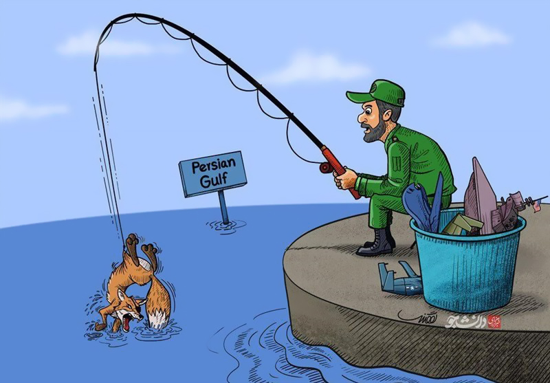 این هنرمند کاریکاتوریست افزود: اثر سوم من نیز، به بحث اقتدار سپاه بازمیگردد. در این اثر یک نیروی ساده سپاه پاسداران انقلاب اسلامی را شاهد هستیم که در تنگه هرمز مشغول ماهیگیری است. آنچه او صیده کرده، ناو جنگی آمریکا، پهباد جاسوسی آنها و در نهایت آخرین صید او که از قلاب ماهیگیریاش آویزان است، روباه پیری است که اشاره به ماهیت انگلیس دارد.