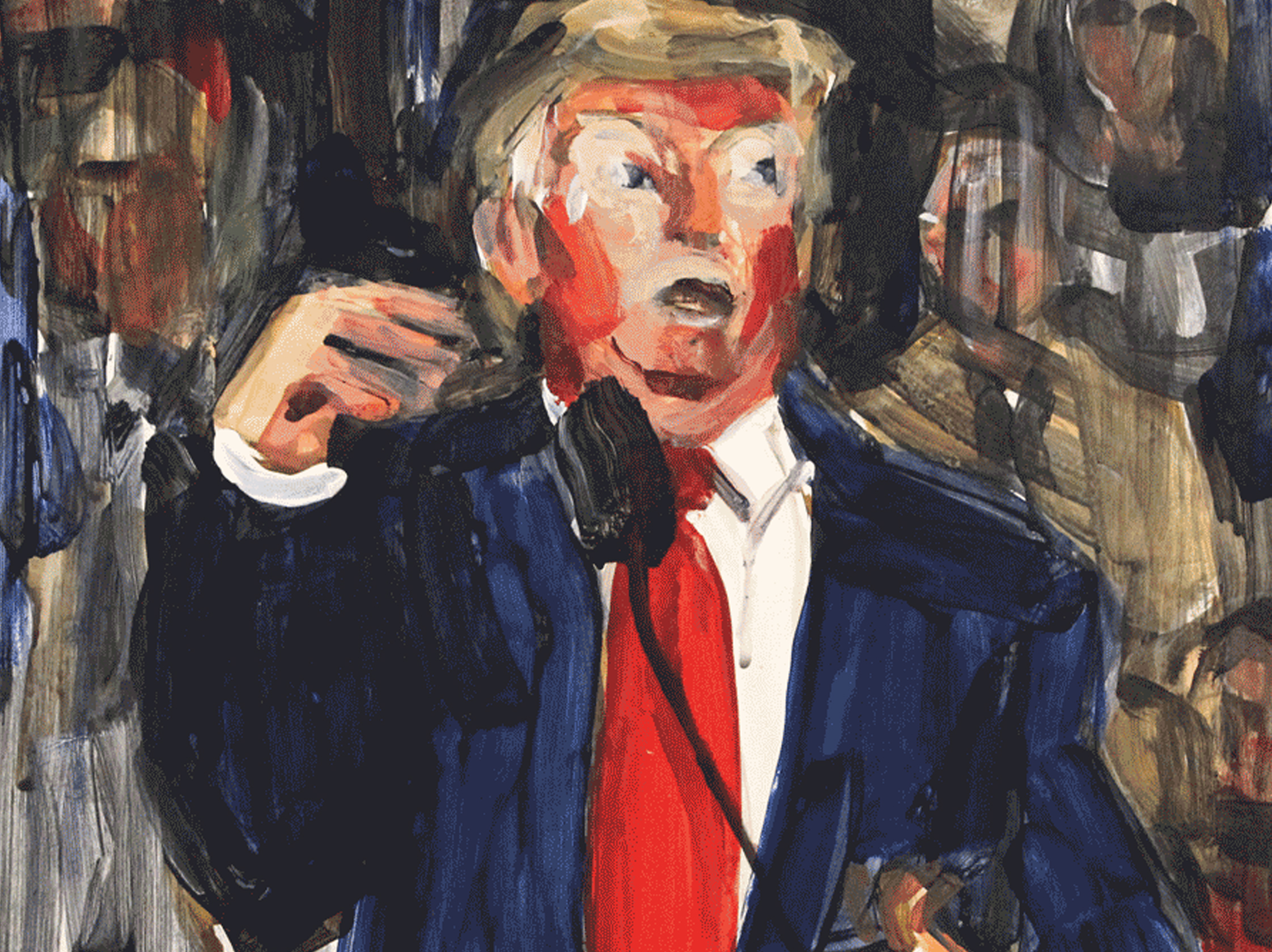 این سه گانه عمدا خیلی سریع نقاشی و رنگ آمیزی شده و حرکات اغراق شده را در چهره ترامپ نشان می دهد که نشان دهنده بی خیالی و بی پروایی اوست. سود حاصل از فروش این تابلوها به جامعه معلولان آمریکا تعلق گرفت.