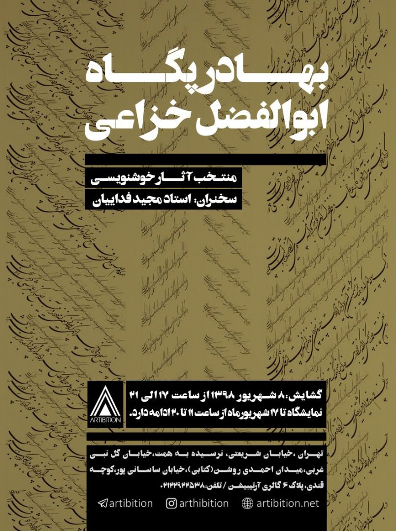 به گزارش روابط عمومی مرکز تجسمی حوزه هنری به نقل از فارس، نمایشگاه آثاری از دو هنرمند جوان هنر خوشنویسی «بهادر پگاه» و «ابوالفضل خزاعی» با رویکرد «تجلیل از هنر کلاسیک ایران» در گالری آرتیبیشن افتتاح شد.