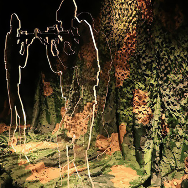 این چیدمان که در واقع از نظر تصویری بر یک فریب استوار است به این شکل عمل میکند که بیننده ابتدا با یک بکگراند کاموفلاژگونه که در لباسهای نظامی مورد استفاده قرار میگیرد روبرو میشود و پس از ورود و نزدیک شدن به چیدمان، دو سرباز را که در این شرایط اختفا کردهاند میبیند ، این دو سرباز درواقع اسلحههای خود را به سمت یکدیگر نشانه رفتهاند اما این نیز روایت یک فریب دیگر است. مخاطب با نزدیک شدن به اثر، با سرباز سومی مواجه میشود که درست بین دو سرباز دیگر به سمت بیننده اسلحهاش را نشانه رفته است.