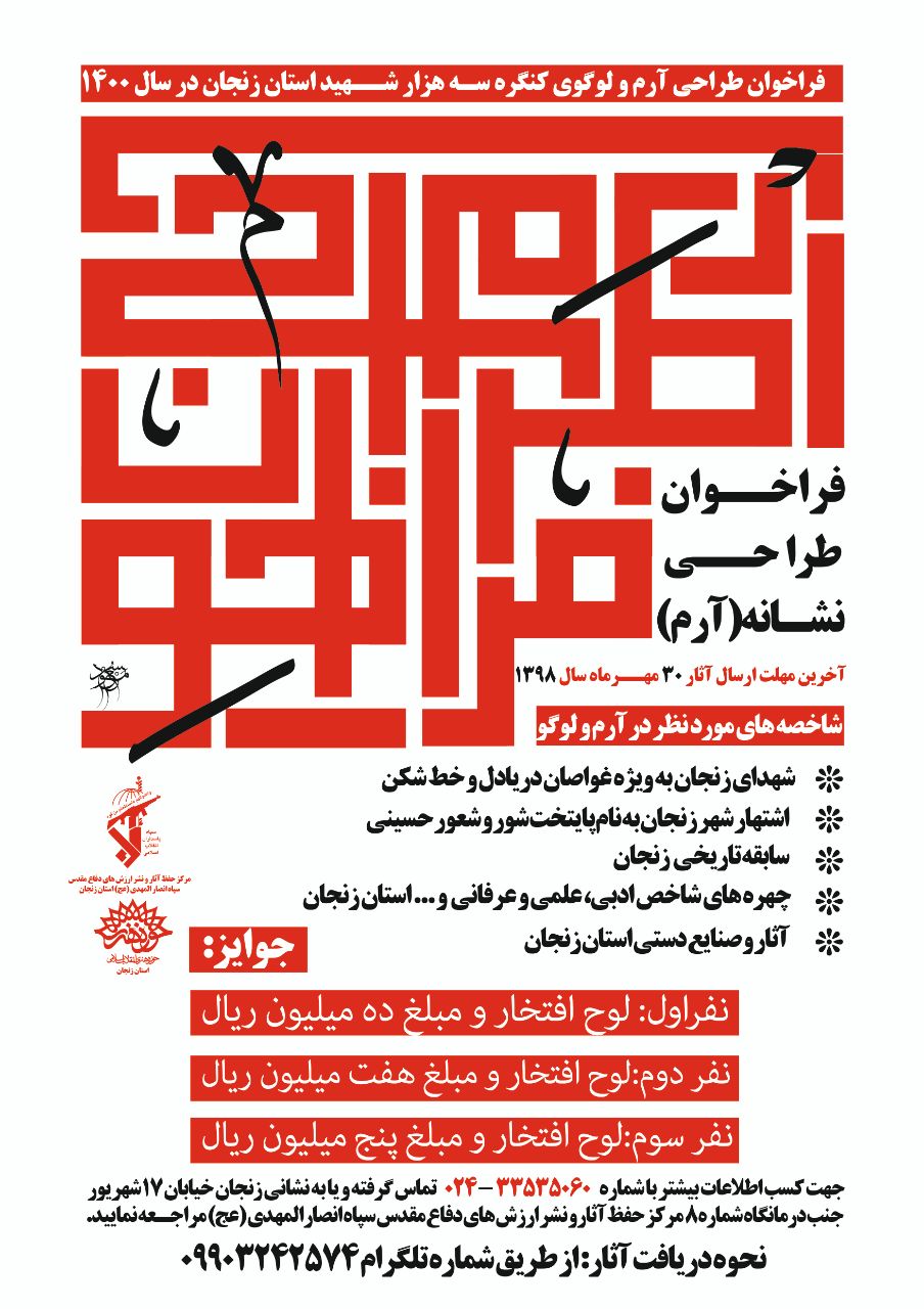 به گزارش روابط عمومی حوزه هنری زنجان، فراخوان طراحی لوگوی کنگره سه هزار شهید استان زنجان با محوریت استفاده از نمادها و نشانهای شاخص استان با همکاری حوزه هنری و مرکز حفظ آثار و نشر ارزشهای دفاع مقدس سپاه انصارالمهدی(عج) استان زنجان منتشر شد.