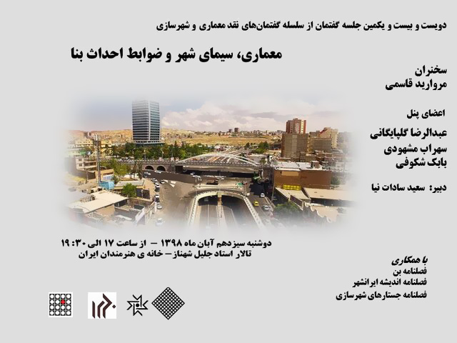 نشست معماری «معماری، سیمای شهر و ضوابط احداث بنا» روز دوشنبه ۱۳ آبان ماه از ساعت ۱۷ الی ۱۹:۳۰ در تالار استاد جلیل شهناز واقع در خانه هنرمندان ایران برگزار خواهد شد.