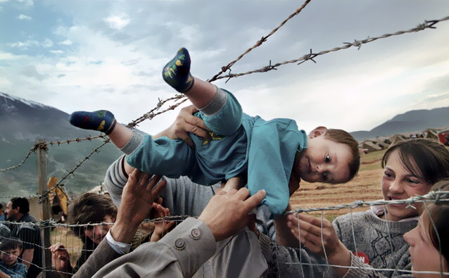 در این عکس که کارول گُزی آن را ثبت کرده اقوام کودک دو سالهای به نام آگیم شلا او را از روی حصار با سیم خاردار به دست مادربزرگش در یک اردوگاه پناهندگان آلبانی می سپارند.