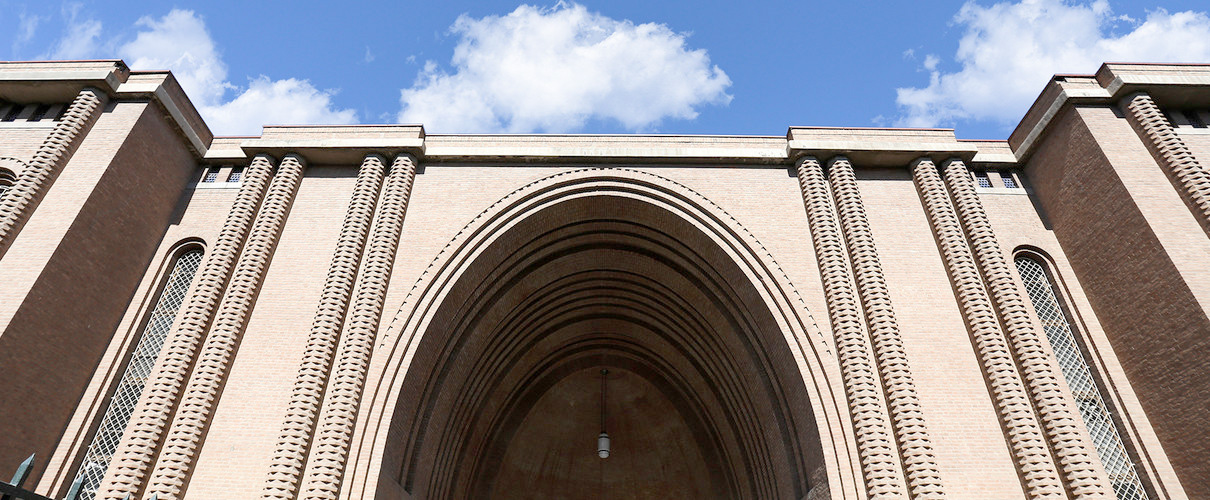 سردر اصلی طرح موزه ملی ایران اثر معمار و باستانشناس فرانسوی آندره گدار، برگرفته از فضای معماری دوره اشکانیان و ساسانیان و به صورت طاق یا ایوانی بلند همانند ایوان کسری در تیسفون و کاخ الحضر در شمال عراق ساخته شده است. ساخت این ایوان را به دو بنّای معروف ایرانی به نامهای عباسعلی معمار و استاد مرادعلی تبریزی نسبت میدهند.