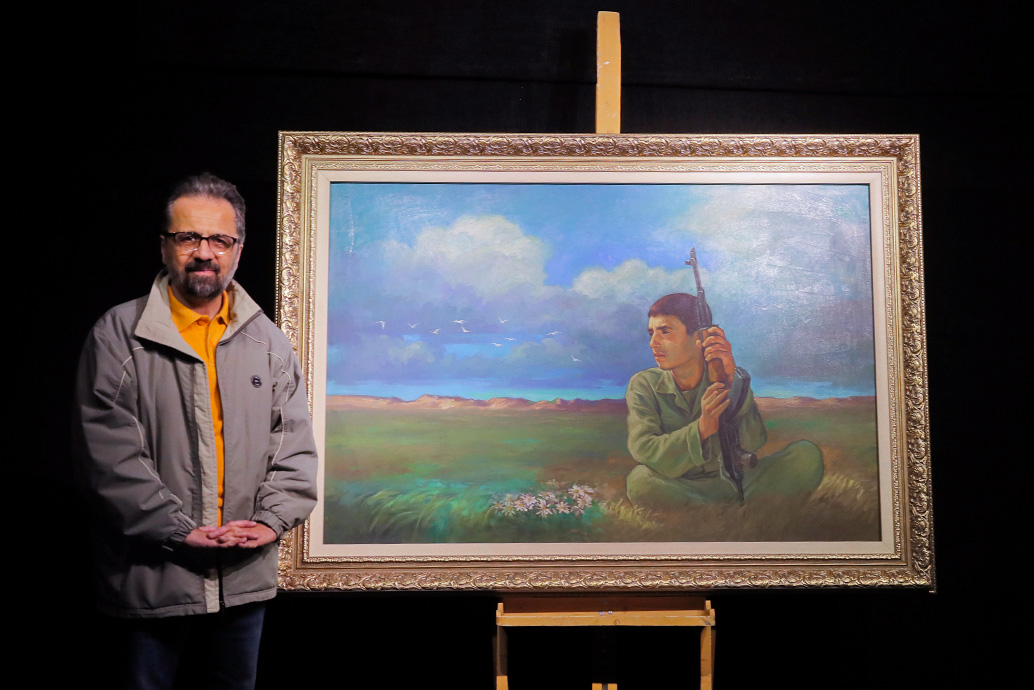 وی تصریح کرد: در این تابلو بسیجی را شاهد هستید که نگاهش به دوردست خیره شده و امید به آینده دارد و همین فکر منجر به خلق این تابلو به نام «امید» شد.