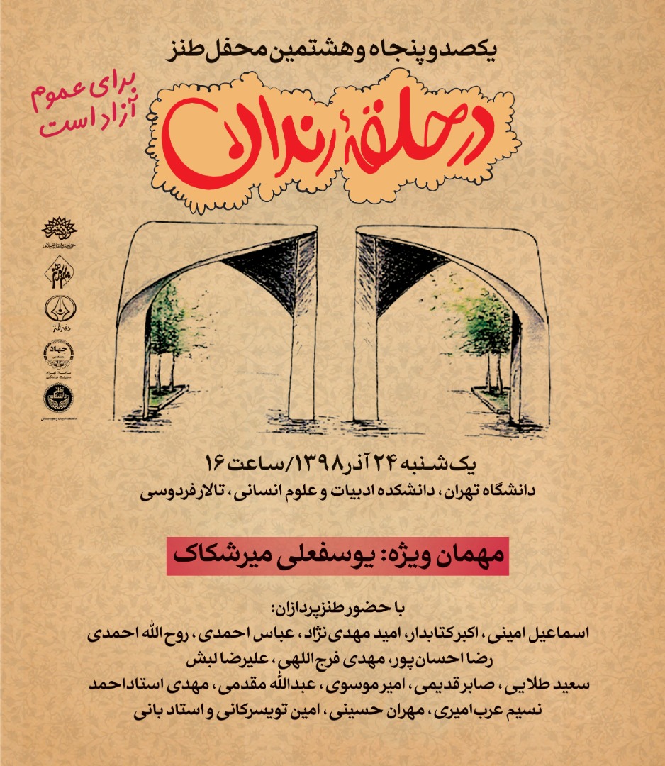 به گزارش روابط عمومی دفتر طنز حوزه هنری 158اُمین شب شعر طنز در حلقه رندان یکشنبه 24 آذرماه 1398 ساعت 16 در تالار فردوسی دانشکده ادبیات دانشگاه تهران برگزار میشود.