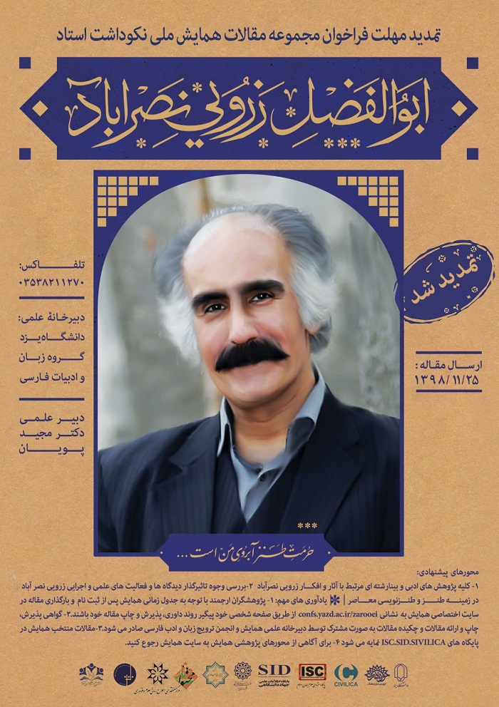 به گزارش دبیرخانه همایش ملی نکوداشت استاد ابوالفضل زرویی نصرآباد در دانشگاه یزد، مهلت ارسال مقالات با موضوع بررسی آثار زندهیاد ابوالفضل زرویی نصرآباد تا 25 بهمن ماه 1398 تمدید شد.