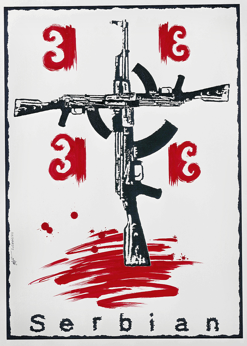 شریفی با نگاهی ظریف به تاریخ، عناصر را از گذشته استخراج می کند و به آنها خاصیت معاصر بودن می دهد. این پوستر که در سال 1371 طراحی شده است ، با کلمه صربستان توجه ما را به جنگ بوسنی و هرزگوین جلب می کند. جایی که در دنیا معاصر باز نمونه یک نسل کشی دینی رخ داده است.