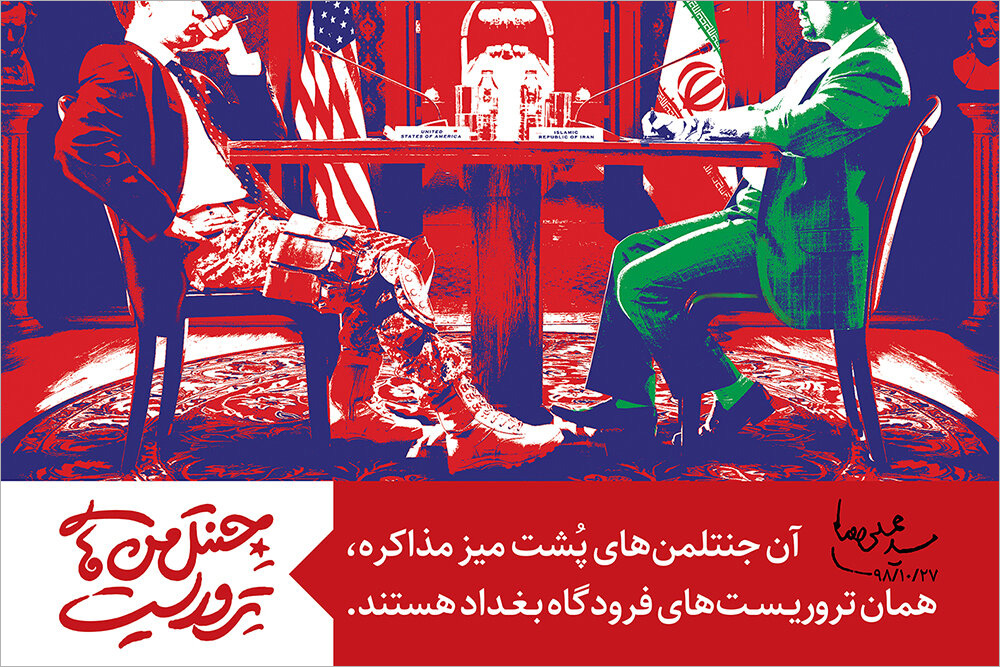 وی در توضیح قالب تصویری و رنگ‌های به کار رفته در این تابلو و مضمون آن بیان کرد: استفاده از رنگ‌های پرچم دو کشور ایران و آمریکا در تنالیته‌های رنگی این طرح مشهور، از ویژگی‌های ارائه جدید این اثر است. مضمون این اثر در همراهی با صحبت‌های اخیر رهبر انقلاب در نماز جمعه تهران پس از ترور فرماندهان ارشد ایران و عراق به دست جنایتکاران آمریکایی است که فرمودند: «آن جنتلمن‌های پشت میز مذاکره، همان تروریست‌های فرودگاه بغداد هستند.»